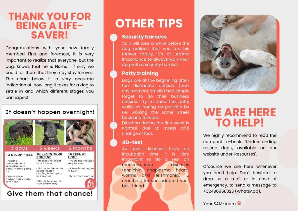 Resources Adoption leaflet SAM The 3-3-3 rule when adopting a rescue A very interesting read Understanding Rescue Dogs – Dog Training College Delen: Click to share on X (Opens in new window) X Click to share on Facebook (Opens in new window) Facebook Click to email a link to a friend (Opens in new window) Email Click to share on Reddit (Opens in new window) Reddit Click to share on Tumblr (Opens in new window) Tumblr Click to share on Pinterest (Opens in new window) Pinterest